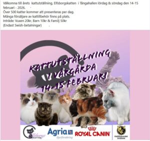Nu är det dags för en helg i katthjärtats tecken. 14-15 feb finns vi på Elfsborgskattens utställning på Tånga Hed i Vårgårda med vårt kattbord med saker för katt och människa. Kom och titta på alla fantastiska katter och handla... läs mer