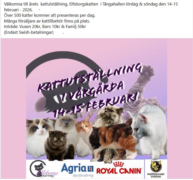 Nu är det dags för en helg i katthjärtats tecken. 14-15 feb finns vi på Elfsborgskattens utställning på Tånga Hed i Vårgårda med vårt kattbord med saker för katt och människa. Kom och titta på alla fantastiska katter och handla hos oss och prata bort en stund. Vi ses väl?